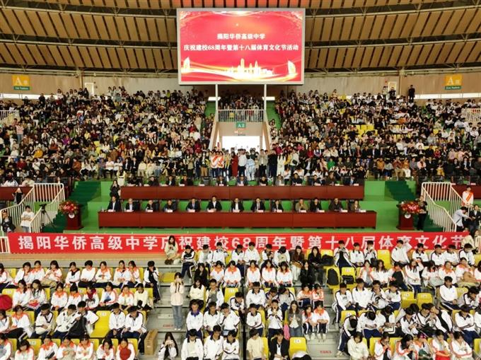 2025年11月29日上午8:30,揭阳华侨高级中学念慈体育馆内气氛热烈、青春飞扬,学校建校68周年庆典暨第十八届体育文化节开幕式在此隆重举行,榕城区教育局党组书记、局长林晓敏同志,副局长谢伟韩同志,郑建明董事长及夫人郑佩卿女士,谢伟斌校长等行政领导,退休教职工、初中学校校长代表,家长代表,校友代表以及全体师生共同见证了这一激动人心的时刻。本届体育文化节以“六八华章传薪火,强身健体报家国”为主题,旨在弘扬体育精神、展现青春风采,营造积极向上、和谐美好的校园文化氛围。