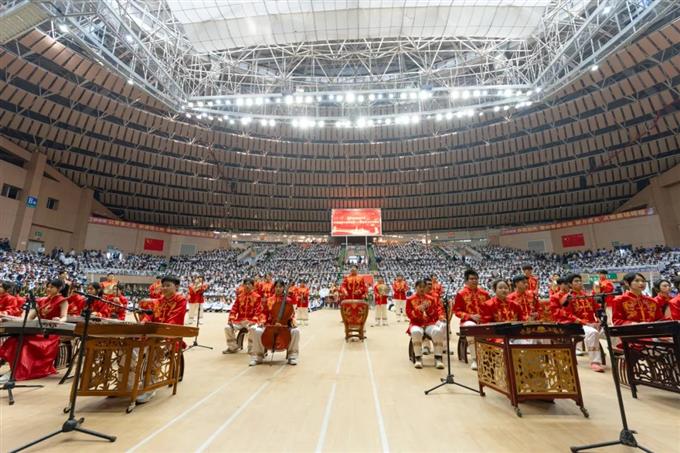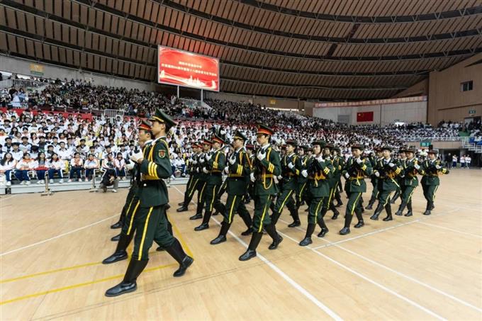 方阵入场完毕后,全场肃立,举行升国旗、奏唱国歌仪式。嘹亮的国歌声中,全场师生心怀敬意,目光坚定。随后,校歌悠扬响起,熟悉的旋律唤起无数侨中人的共鸣与自豪。这一刻,信仰与情怀交织,凝聚成前行不竭的力量。