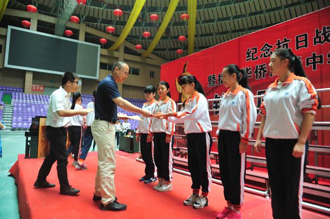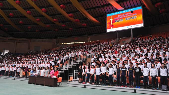 11月7日上午,由学生处、团委主办的“铭记历史,唱响中国梦”纪念抗日战争胜利70周年暨揭阳华侨高级中学58周年校庆合唱比赛在念慈体育馆内举行。副校长祁有刚、曾希展、朱海燕以及高一级级部主任谢伟斌、王银篷与1700余名师生一同观看了比赛。