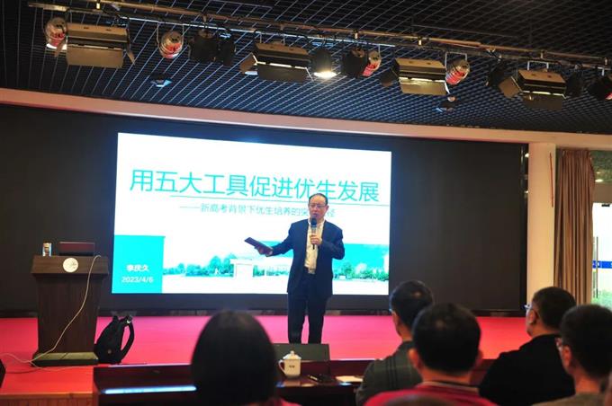讲座中,李教授首先明确了新高考的性质,并以经典高考真题解析为依托,强调僵化的答题套路和盲目的题海战术无法适应新高考变革;接着深刻剖析了“四新高考”背景下的高考命题的新变化、新趋势,为科学高效备考指明方向;最后以众多名校备考经验为案例,针对学生学习效率不高、答题不精准、分数上不来、应对新题型能力不强等问题,从“教的有效、学的高效、练的规范、考的满意和一生一策”五个方面详细地讲解了高考备考和优生培养的策略。
